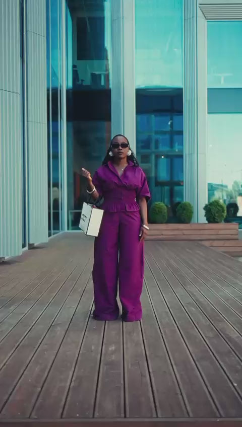 The pants feature a relaxed wide leg, an elasticated back waistband (very bloat-friendly), an invisible side zip, and two functional pockets. The shirt is cinched with a smokey waist panel for a subtle snatch, while roll-tab sleeves let you adjust the length to your mood.